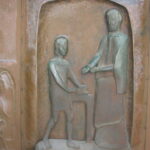 The Torah Shrine: The third panel shows a representation of a Torah ark flanked by ritual objects including menorahs, a shofar, a lulav, and an etrog, highlighting the synagogue’s religious function and connection to Jewish traditions.